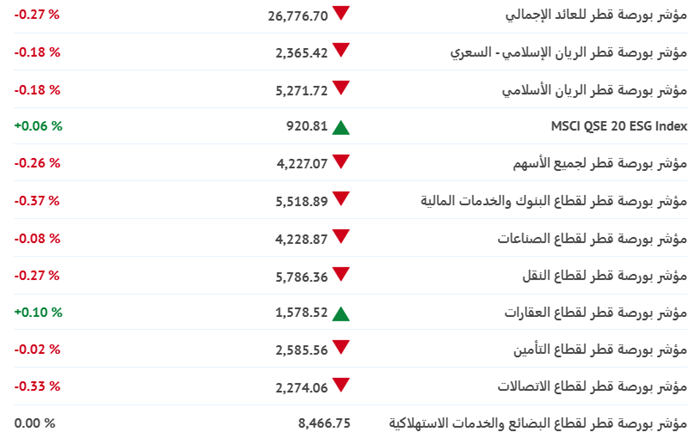 ومع حلول الساعة 09:45 صباحًا بتوقيت الدوحة، بدا المشهد مائلًا للهبوط، بعدما فقد المؤشر العام 31.72 نقطة، ليستقر عند مستوى 11197.50 نقطة، مسجلًا تراجعًا نسبته 0.28% مقارنة بإغلاق جلسة أمس الثلاثاء.